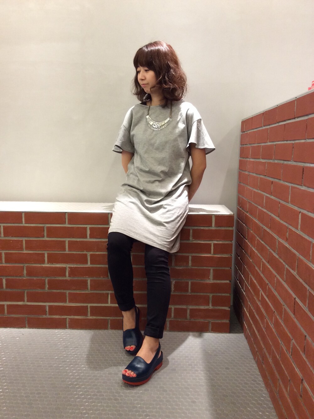 厚底サンダルのオレンジを際立たせる為に、シンプルなワンピースを合わせてみました。