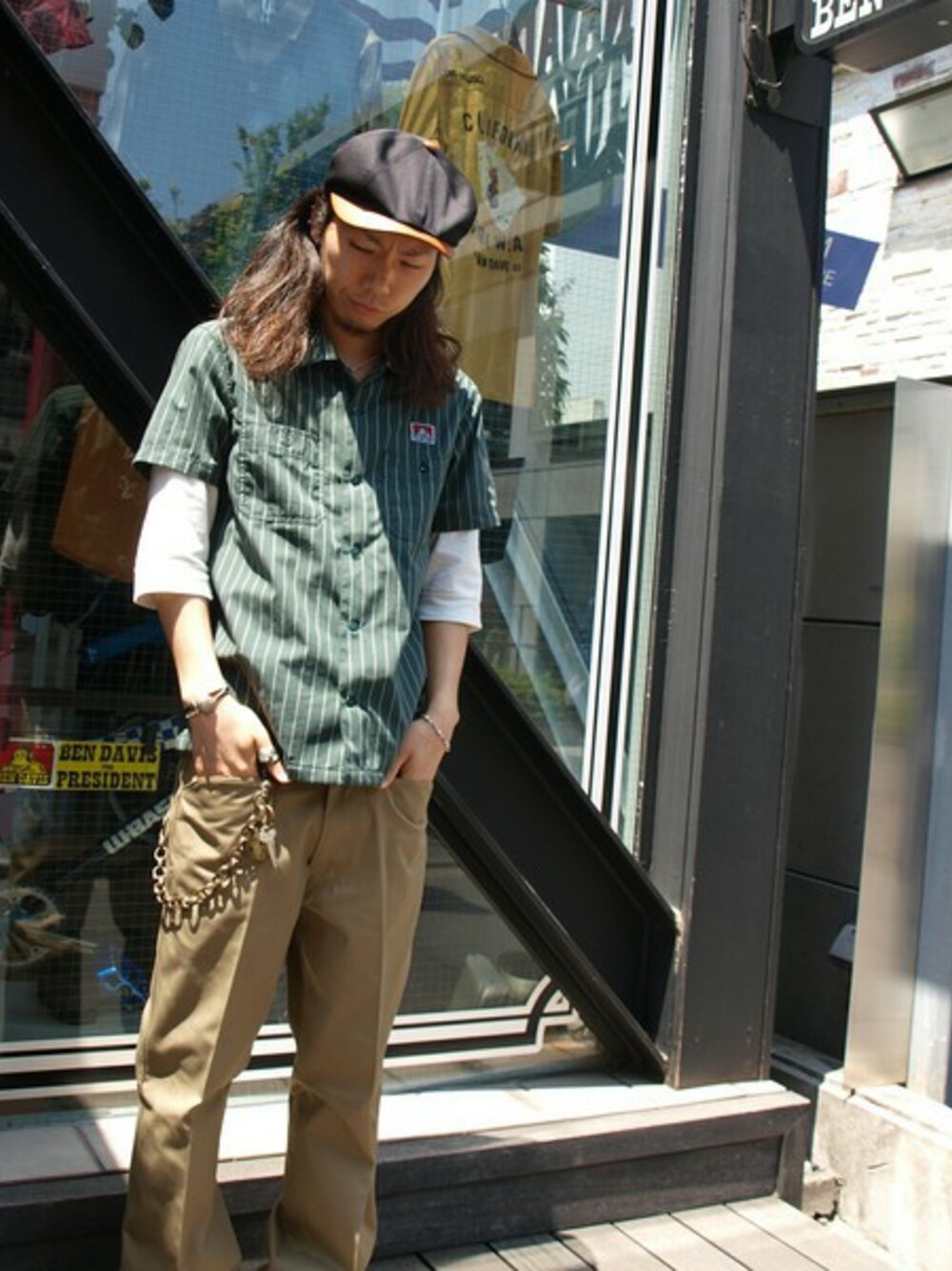 硬くなりがちなストライプシャツをワークパンツとスニーカーでラフに合わせました。