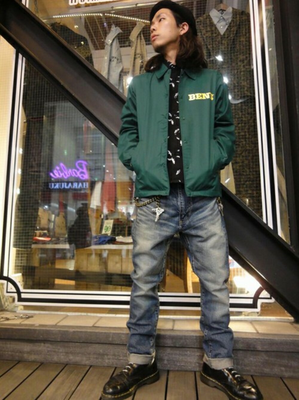 コーチジャケットのコーディネート。 インナーに柄シャツを入れ、デニムシャツでアメカジ風に仕上げました。