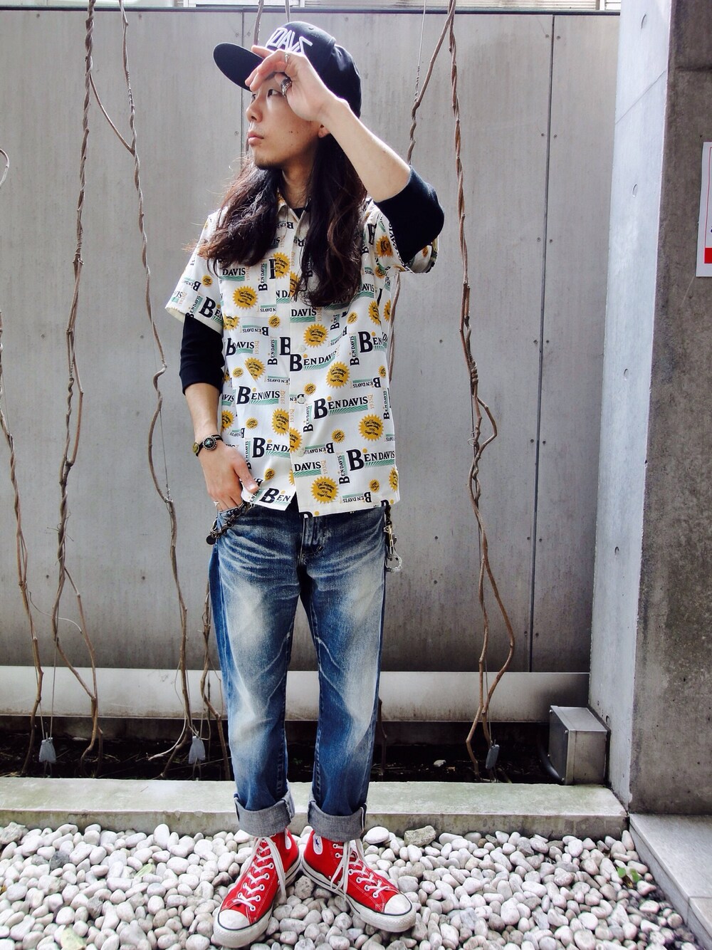 ピックアップタグが『柄シャツ』ということで BEN DAVIS WHITE LABEL 2015 S/Sより 〝vintage all over shirts〟 をメインにコーディネートしました。 ちなみにこいつは同生地でshortsの展開もあり、夏は派手にセットアップを組んでハッピー野郎になれます。是非。 しかしZOZO TOWNにはデータ反映されておらず。 通販ご希望の方、もう少々お待ちください…
