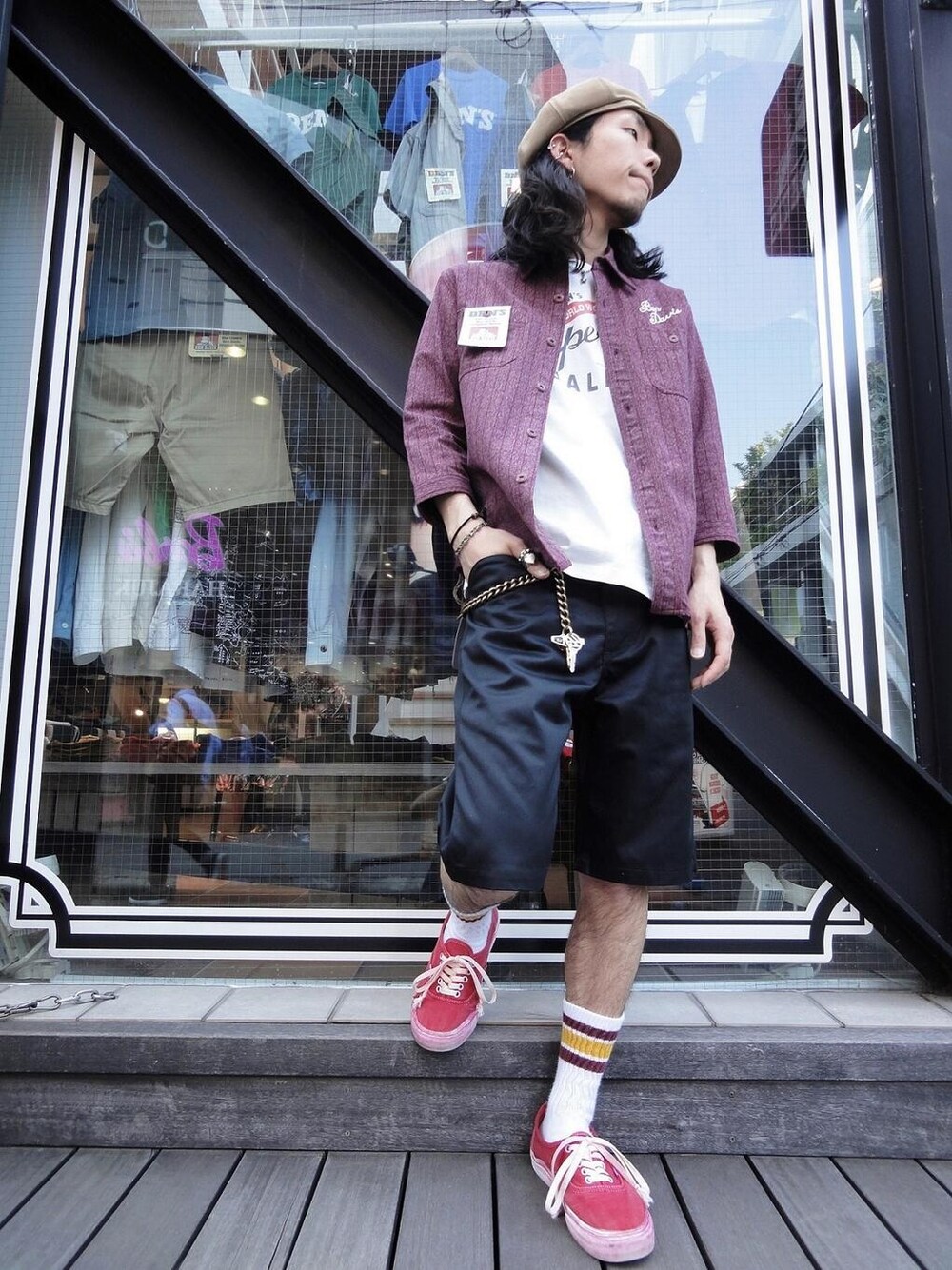 ヴィンテージプリントのTEEに7分シャツを合わせたスケータースタイル。 半端丈のボトムスで夏らしく!