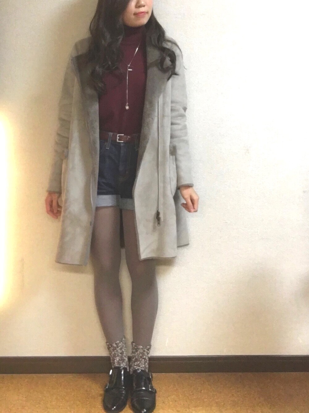 先ほどのコーディネートの、ノーカラーコートバージョンも。 そして、リバーシブルのフワフワ面の裏側を 表にして着てみました こうするとグレーとボルドーを合わせた感が増すね。