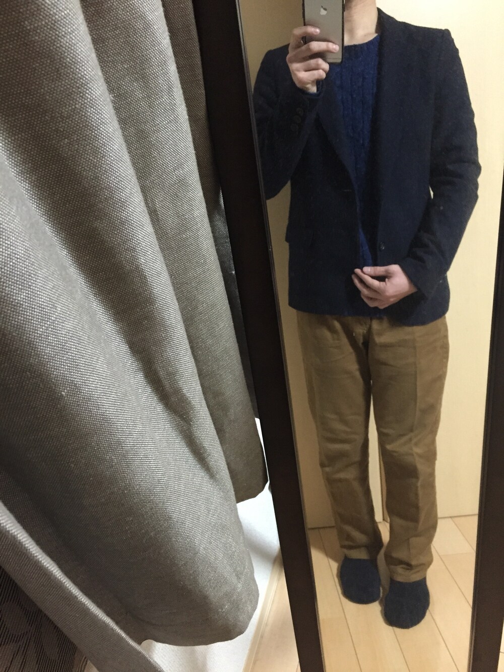 秋冬のジャケット&ニットスタイル ウール素材のネイビー色ジャケット着用してますが、ブラウンのカラーパンツで硬くなりすぎないように。
