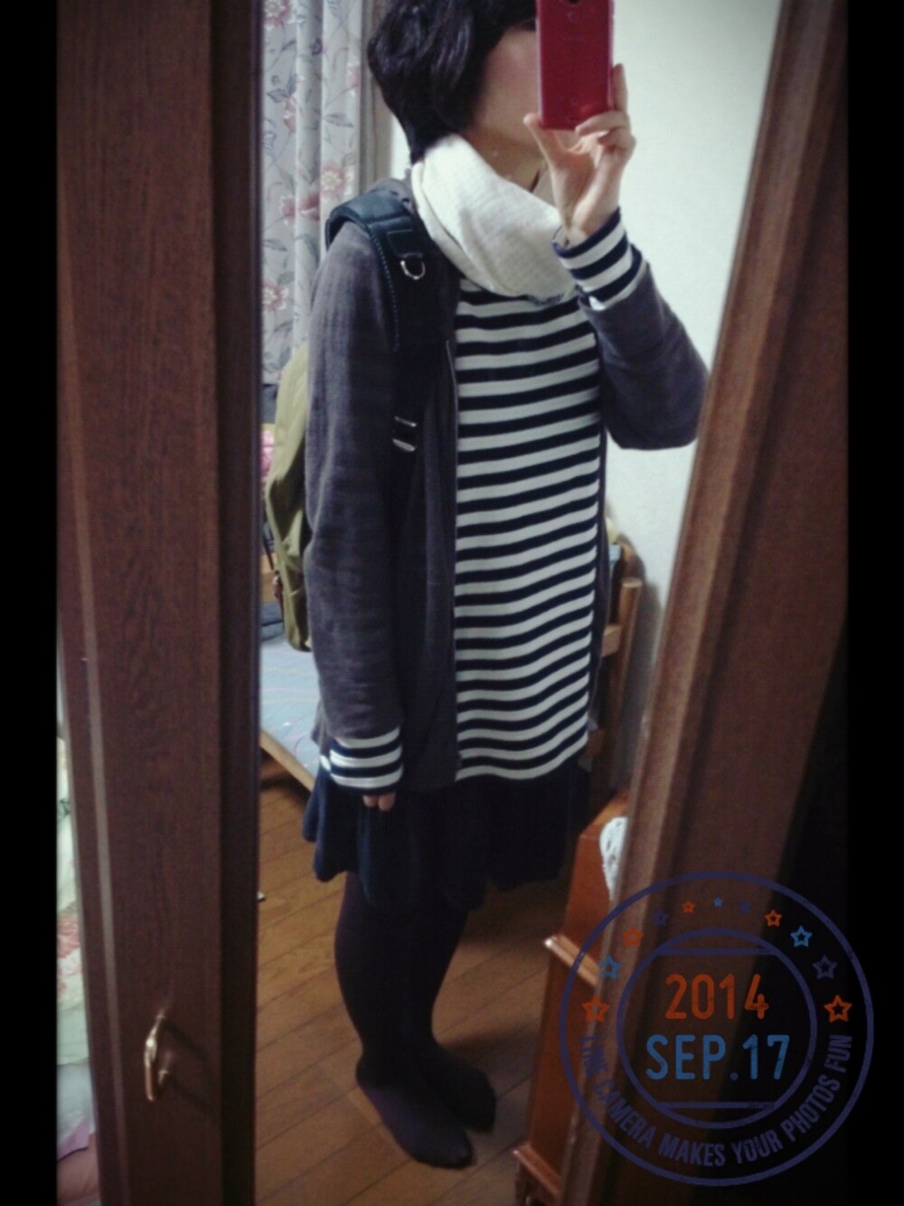 寒くて寒くて、ついにタイツ解禁\(^o^)/ パープル系のタイツに、ネイビー×ホワイトのしましまワンピ、パープル系のリネンパーカーでちょっと大人っぽくまとめたつもりです♪ ストールぐるぐるしないと、帰りなんか寒すぎて風邪引いてしまいそうです…(>_<) そして、お気に入りのリュック♡ 最近は通勤にもリュックを背負ってしまうほど、リュック大好きです…( ´-`)♡るん♪ 語尾に「るん」を付けるのがここでの密かなマイブーム♪(笑) 大好きなchimoちゃん用語♡