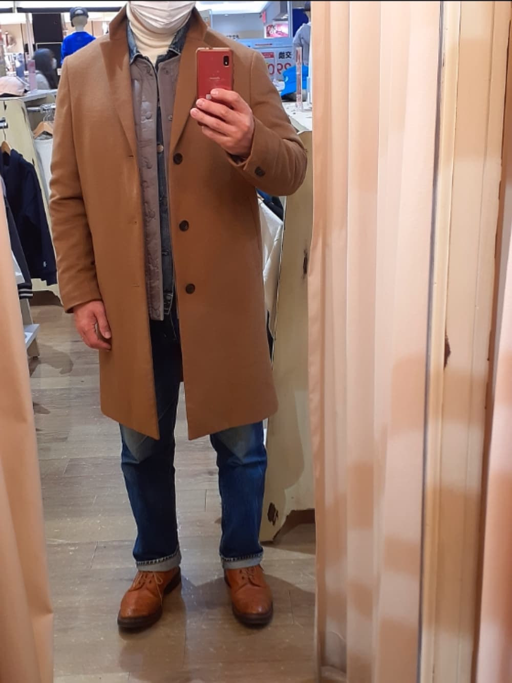 キャメルのチェスターコートにデニムをセットアップ風に合わせて。