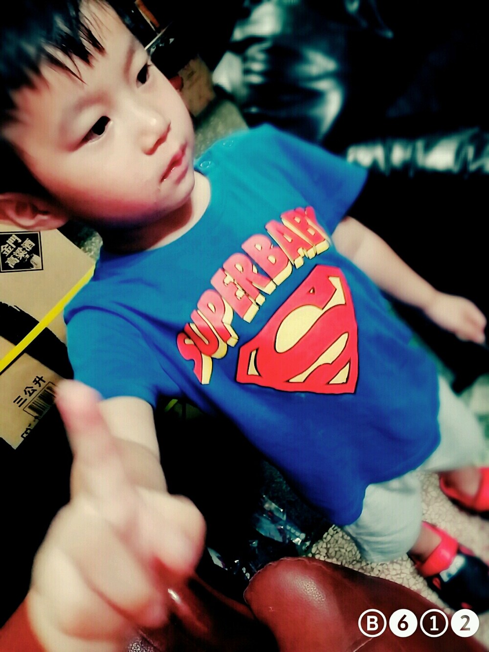 ブルー系のトップス、グレー系のパンツを着用したキッズの春コーディネートの1枚目の写真