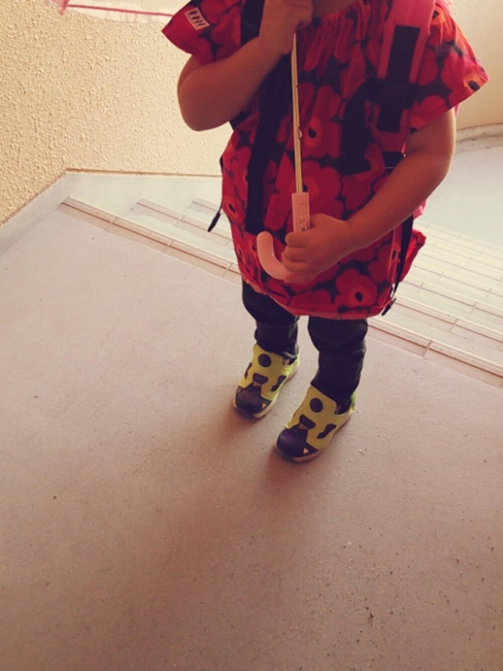 ブラウス●marimekk(handmade) スニーカー●リーボック 靴は次女お気に入り。 雨じゃないのに傘をさしたいらしい。 肩には虫除けのくまもんシール(笑)