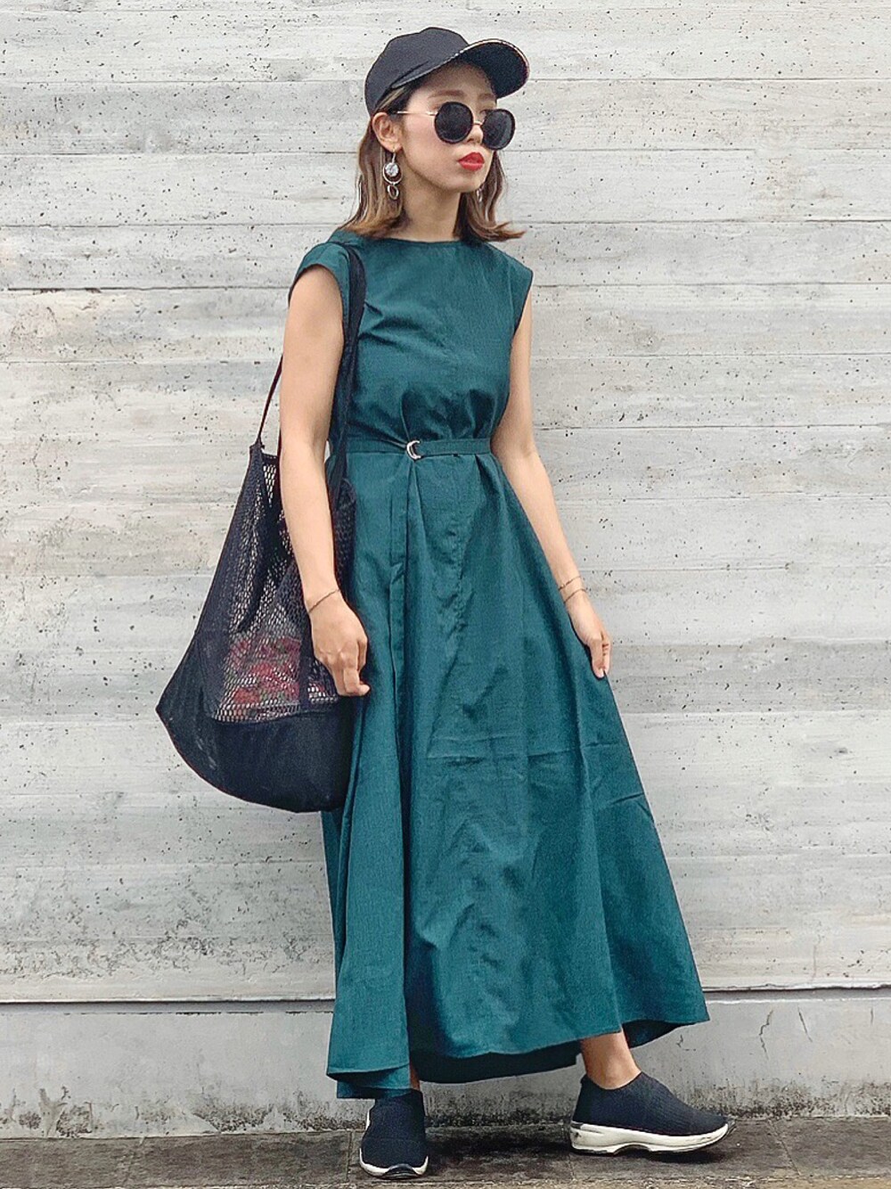 キレイめワンピは小物でカジュアルダウンして 普段着コーデにするのが好き♥ メッシュバッグから🍓見えてるよ笑