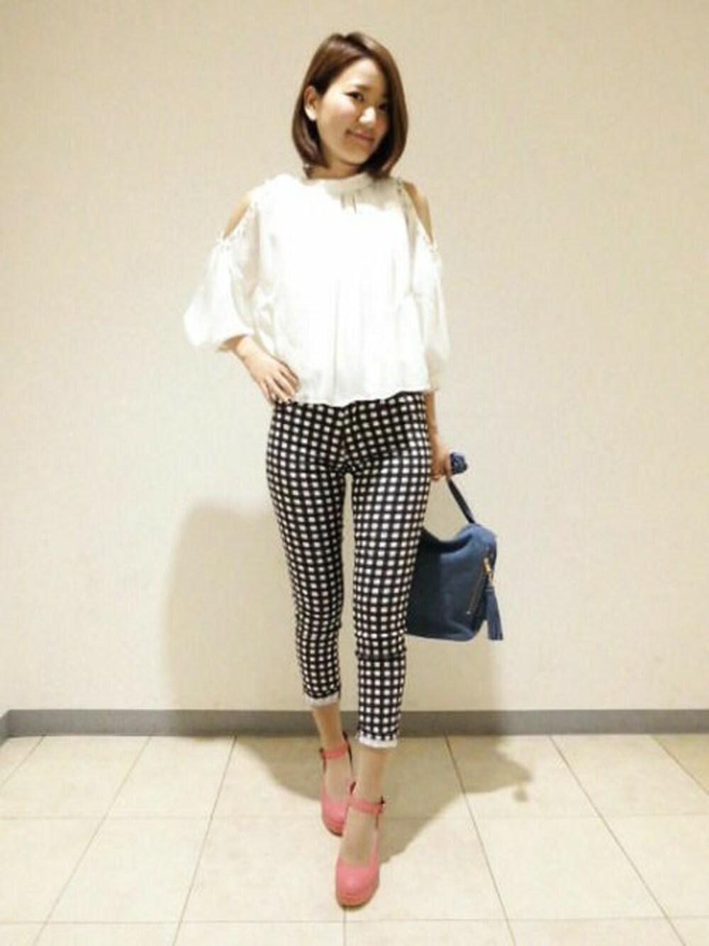肩のチラ見せがセクシーなブラウスは丈が短めなのでパンツとの相性が良いです!! 差し色でピンクを入れて女の子らしさをプラス☆