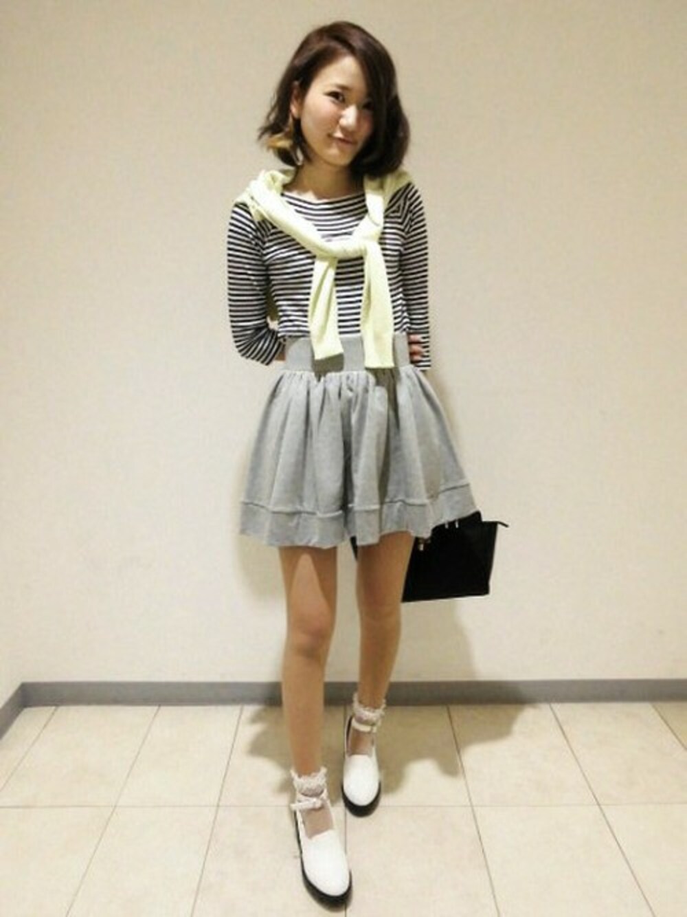 全体的にモノトーンでまとめ、差し色でイエローを持ってきました☆ウラケのスカートはウエストがゴムになっているので履きやすいです!!