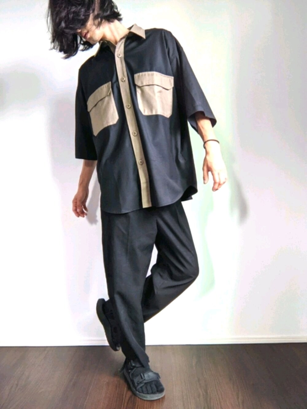 act'mのシャツの素材は、ポリエステルとレーヨンなので光沢感があって ひんやりした着心地。 夏にピッタリのシャツ。 178センチなので、Lの丈感がゆったりで丁度いい。