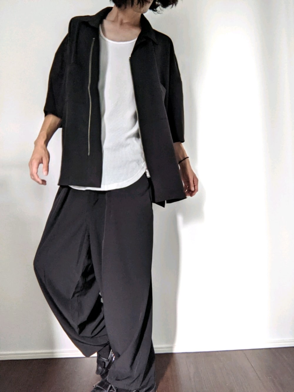 黒×黒のセットアップ。 WEARISTAでありADRERのKEIさんのこだわりの詰まった黒のセットアップ。 ポリエステルが80%以上含まれていて涼しく感じやすい。 高級感のあるドレープで黒なのに重く感じさせないところが好き。