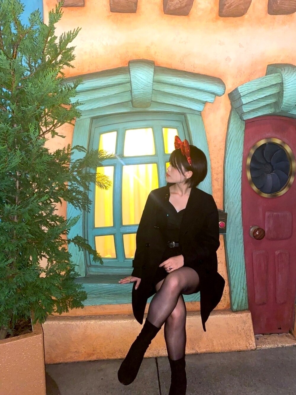 大人っぽくディズニーを楽しむなら黒のコーデに赤のカチューシャが映えるかなと🎀 ワンピースっぽく見えますがトップスとスカートで別々のものになってます♡
