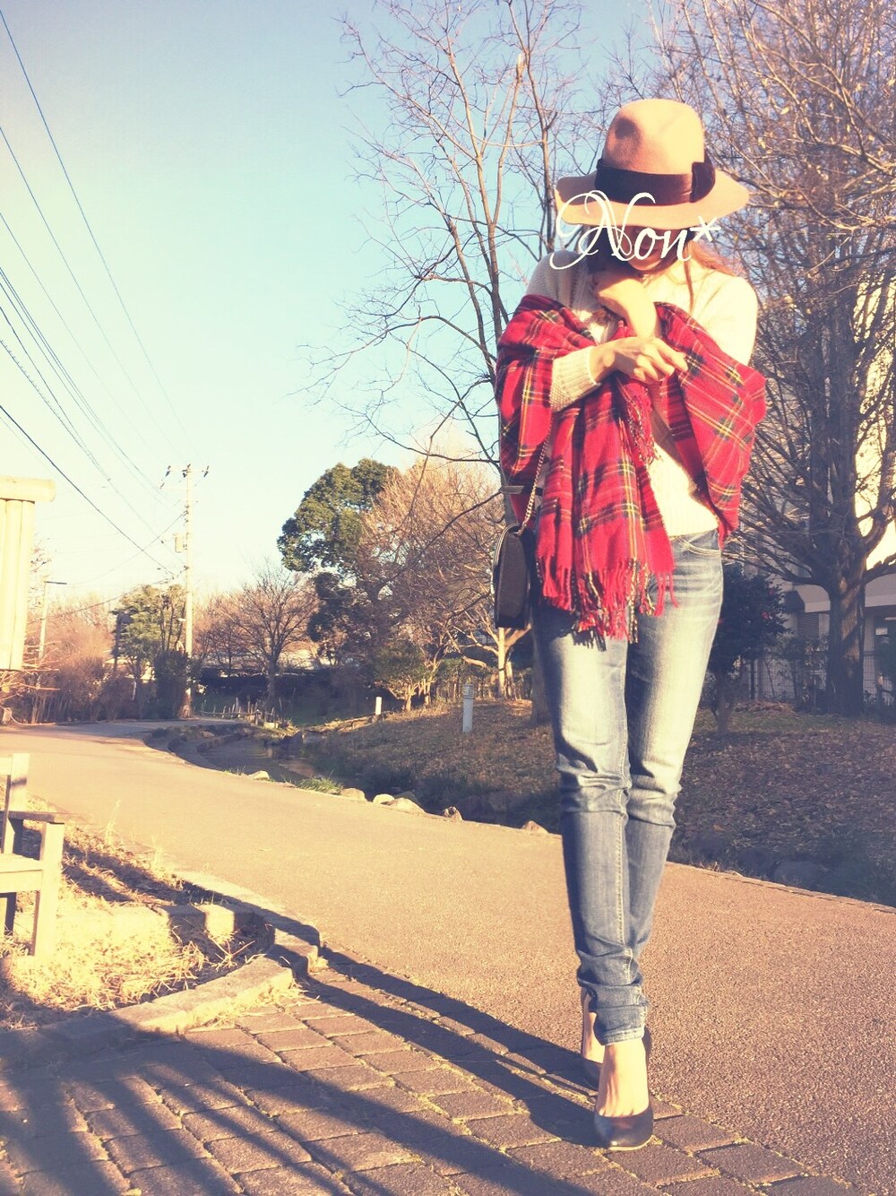 赤のチェックストールは ボリューム感満点で暖か♡