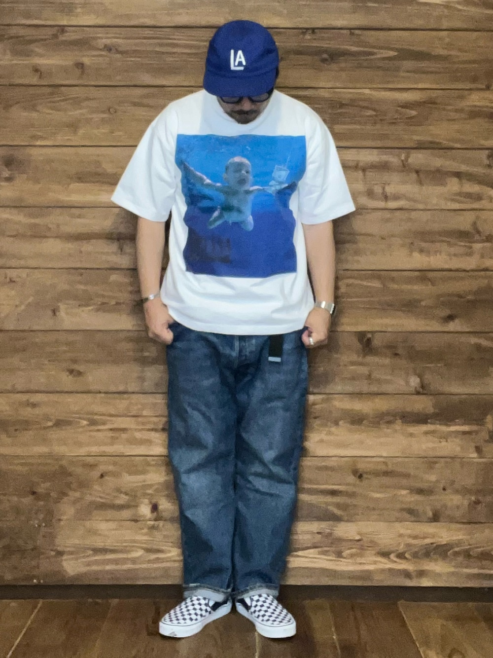 定番のデニムスタイルに、ニルバーナのフォトTシャツでアクセントをプラス。キャップとチェッカー柄のスニーカーでカジュアル感を出しつつ、全体をブルー系でまとめて統一感を意識しました。