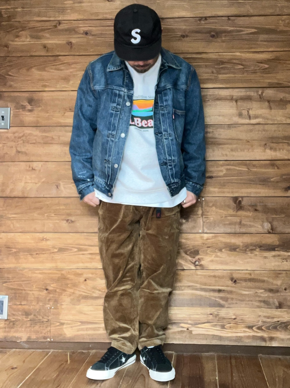 デニムジャケットにコーデュロイパンツで秋らしいカジュアルコーデ。ゆるめのL.L.Beanのスウェットでリラックス感を出しました。 キャップ Supreme アウター Levi’s スウェット L.L.Bean パンツ Gramicci スニーカー Converse