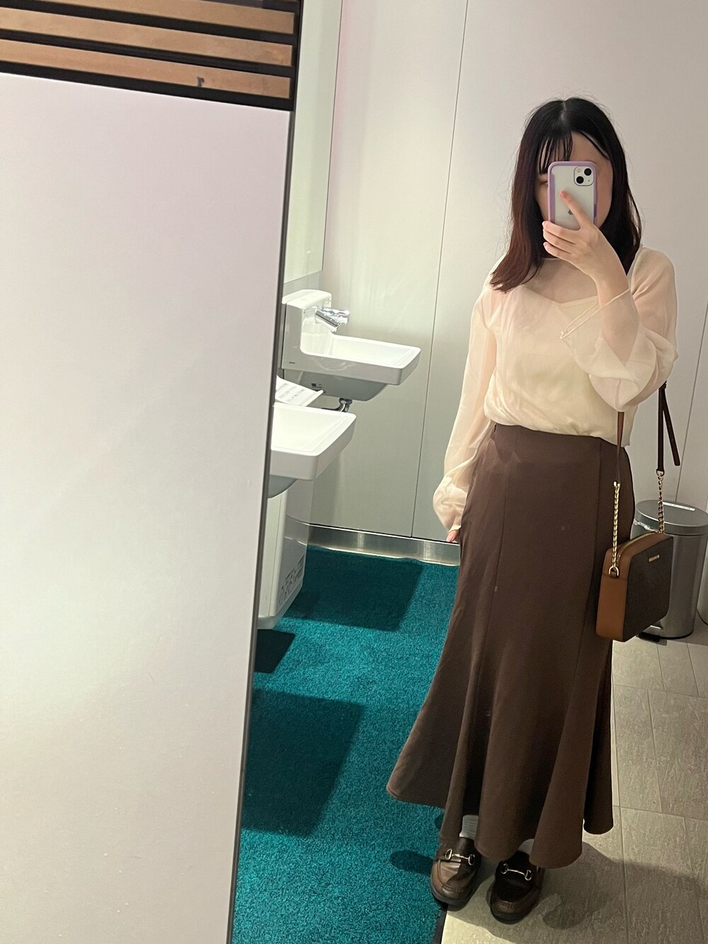 少し早いですが秋服はじめました🍁🍂 アイボリーとブラウンで秋っぽくしてみました。 秋は暑かったり寒かったり気温差があるのでシアーブラウスがぴったり🌟