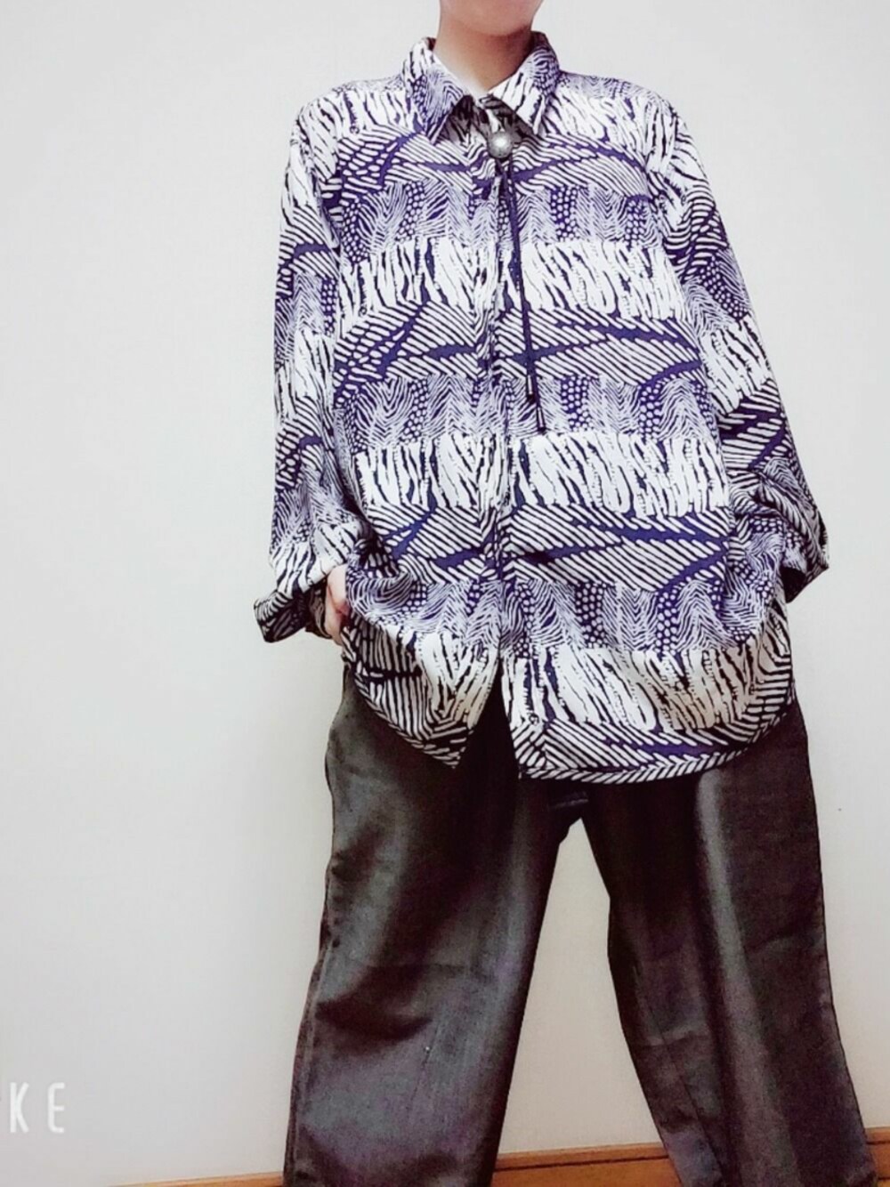 古着屋Remさんのセットアップコーデです。 プレゼント企画に当選したのでゼロ円です。ゼロ円コーデです。 トップスを選んで、古着屋さんの中の人がそれに合わせてコーデしてくれました。 ゼブラ柄っぽいトップスに光沢あるグレーのスラックス。 控えめにいって最高かよ!なコーデです。 ループタイはアベイル!!