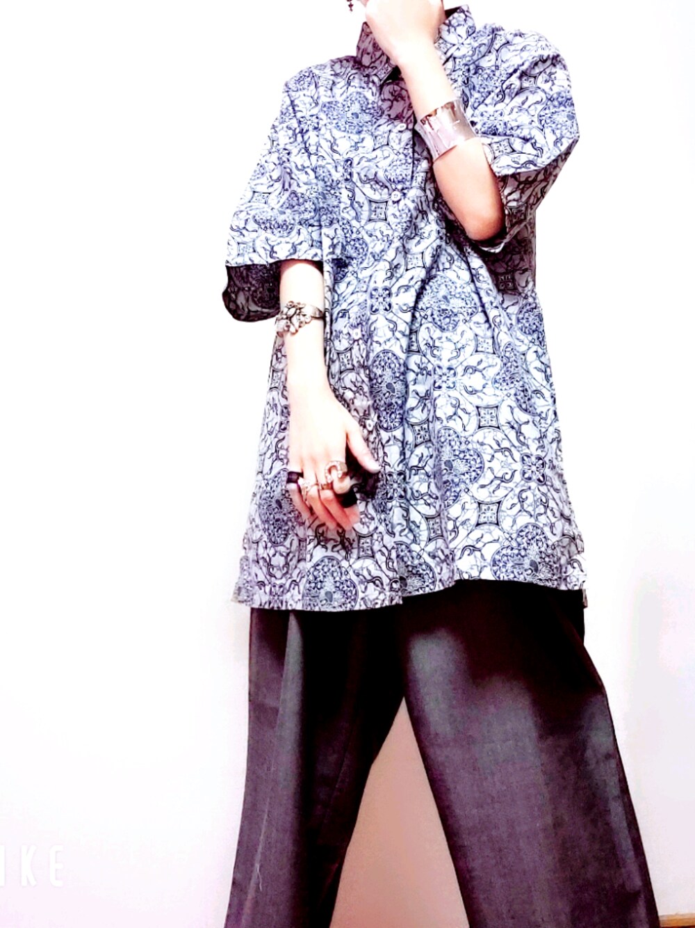 古着屋Remさんコーデ 柄シャツ、スラックスは古着屋Remさん オニューのバングルは古着屋結々さん(お高いやつ(笑)) 夏らしい涼しい軽装です。