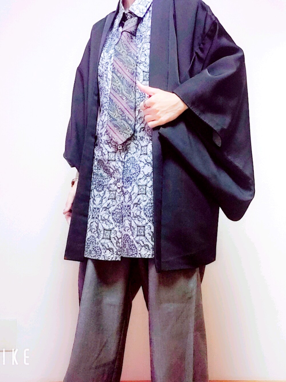 黒羽織コーデ 古着屋Remさんの黒羽織とシャツ、ネクタイのセットを購入したので、持っていたスラックスと合わせて。 和の中にスラックス、ネクタイ、シャツを取り入れることで少しライトか和コーデになってます。 セットの内容は古着屋さんが私がよく着るコーデを参考にセレクト頂きました。 黒、銀、赤、青の4色でかっこよいです!!