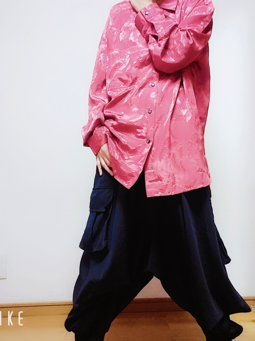 CIWさんのBOXに入ってた光沢あるトップボタンがチャイナっぽい赤シャツにゆったりサルエル。