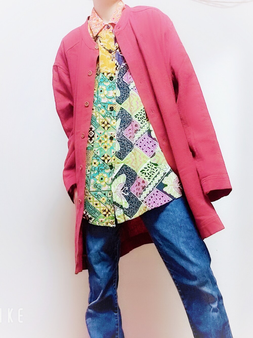 iot×Cakaさんの周年BOXに入っていた赤カーディガンと総柄のカラフルなシャツ。 普段モノトーンなのでこうゆうカラフルなコーデは珍しいです(笑)