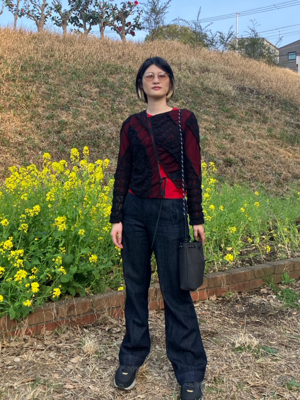花見に行きました。 カッコイイ寄せ。 昨年購入したUNITEDTOKYOのシアーシャツをGUのシアーシャツに重ねて、流行りのレイヤードスタイルにしました。
