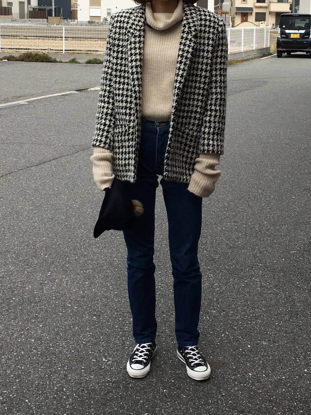 おばあちゃんのおさがりの千鳥柄ジャケットに、 お気に入りの古着屋さんで買ったY'sの袖ずるずるのニット