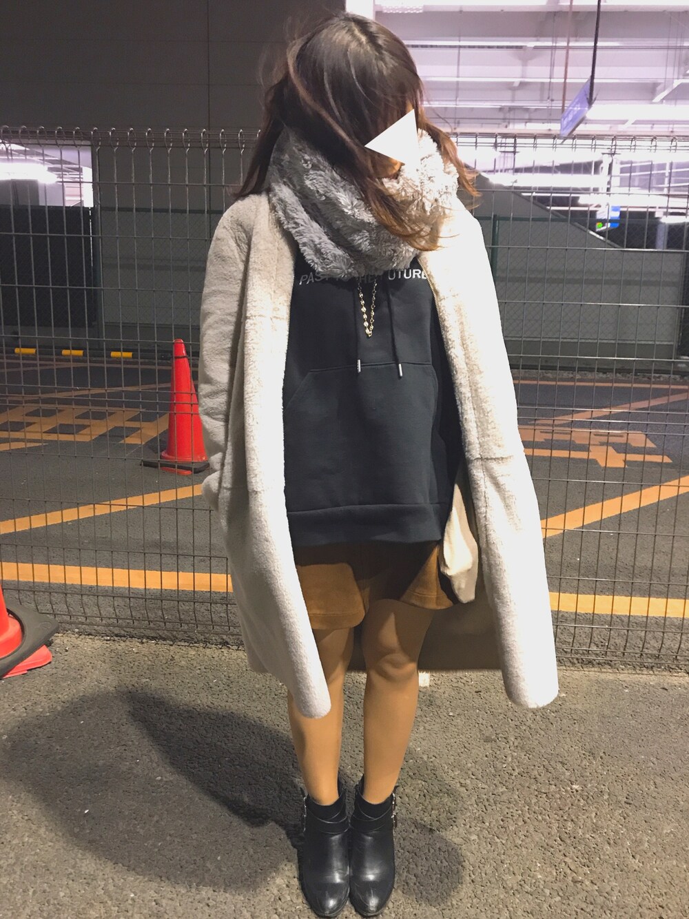 風で髪の毛ぐちゃぐちゃ。 今日はスポーティ✨ パーカーにミニスカート