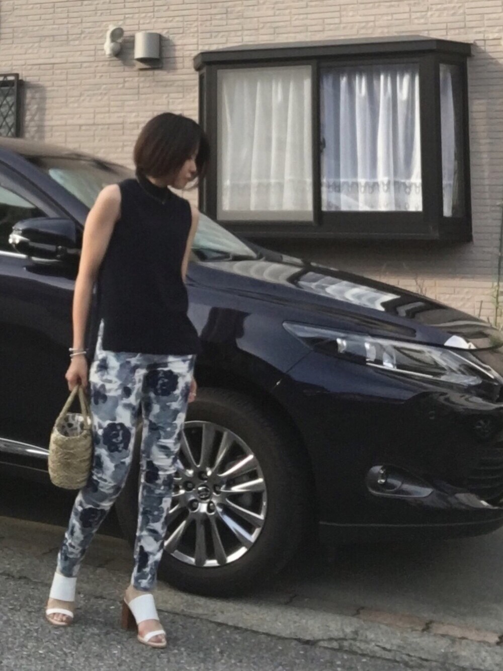 お土産を届けにお出かけ! 柄パンにノースリーブニットを合わせて キレイめコーデにしました☆