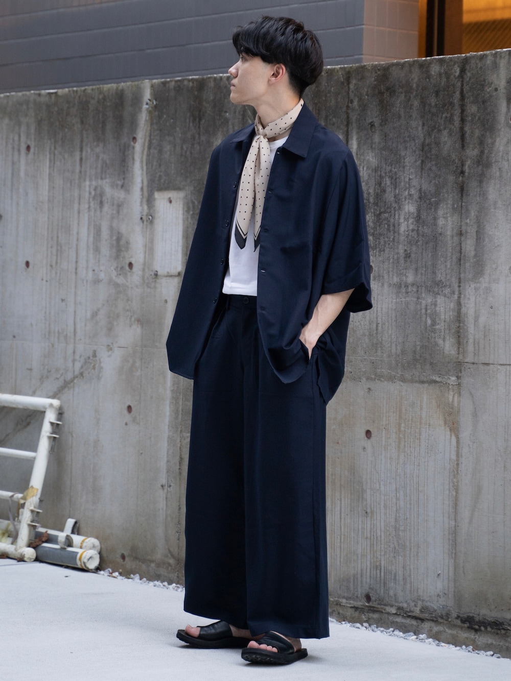 ponのセットアップ「【MinoriTY】落ち感ドルマンセットアップ メンズ オーバーサイズ 半袖シャツ+ワイドパンツ 無地 スラックス ルーズシルエット 5分袖 秋服 夏服(セットアップ2点セット】」を使ったコーディネート