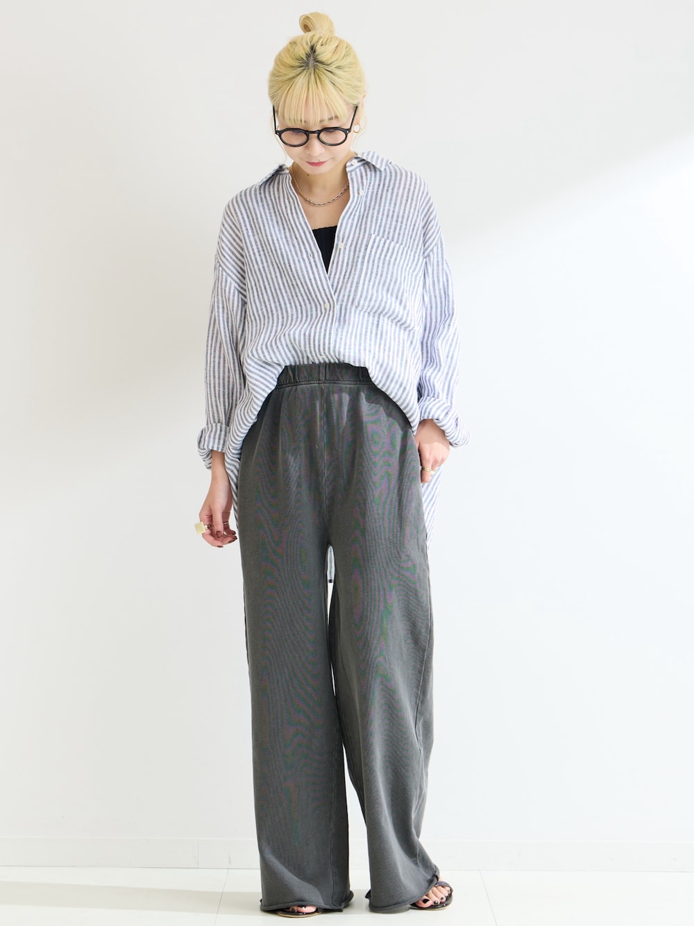 リネンシャツにスウェットパンツを合わせたゆるっとリラックスコーデです。 インナーを黒のニットタンクで合わせる事で女性らしい抜け感のあるスタイリングに。 ※その他眼鏡、サンダルはスタッフ私物 Instagram▷@aigram28