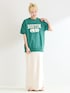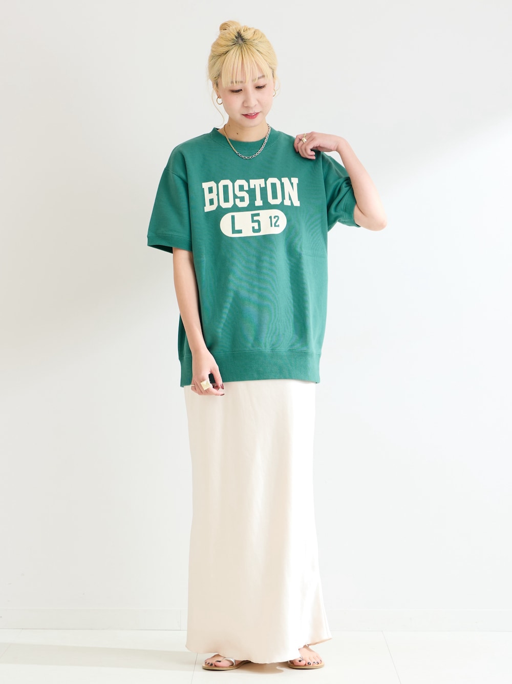 スポーティな印象の半袖ロゴスウェットにサテンスカートを合わせて大人カジュアルに着てみました。 ※その他サンダルはスタッフ私物 Instagram▷@aigram28