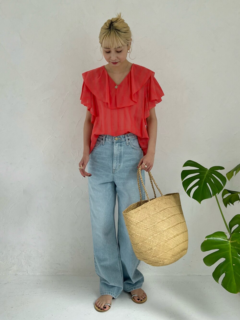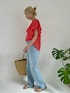 夏を感じる柔らかいオレンジのブラウスをメインにシンプルにデニムとコーディネートしました。 着丈は長すぎず、ウェストにインせず着ても違和感なく着られます。 ※その他バッグ、サンダルはスタッフ私物