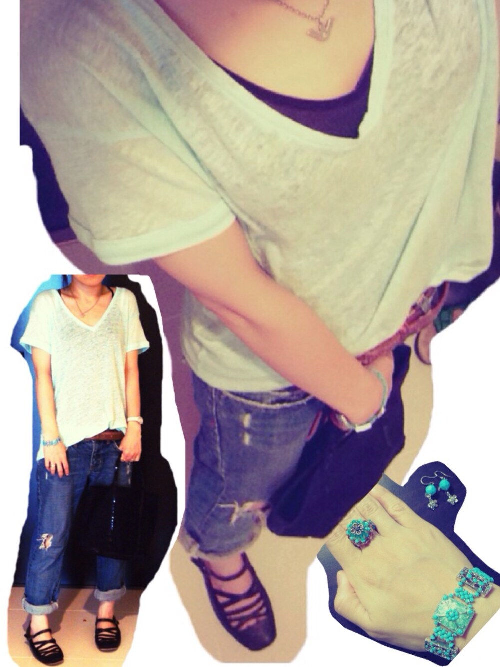 涼しげブルー◎リネンニット◎肌触りもgood アクセサリーはターコイズで統一してみました。 リネンニット:majesticfilatures ダメージデニム:UNIQLO パンプス:SAYA
