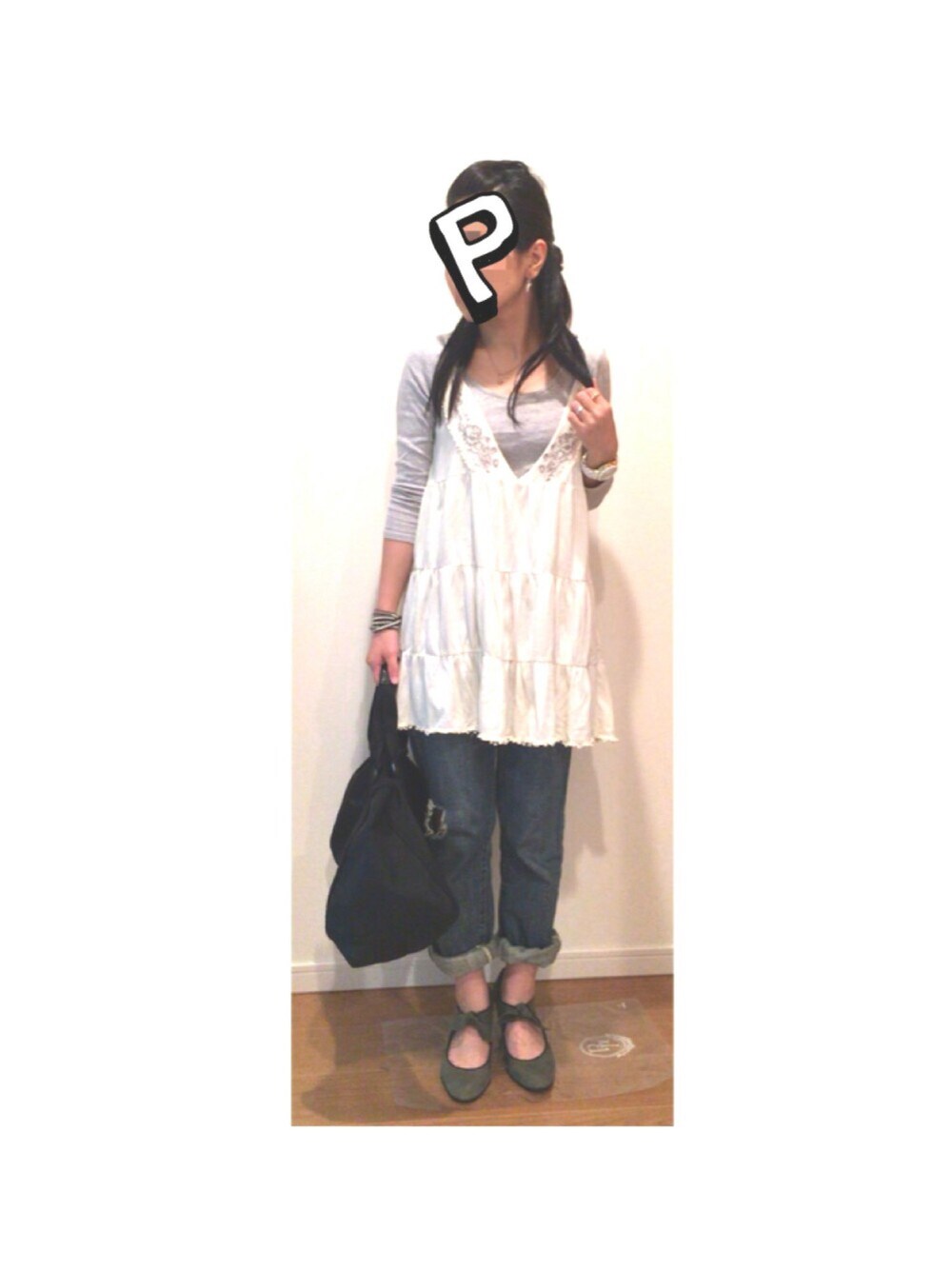 Tシャツ、ダメージデニム: uniqlo キャミワンピ: 古着屋 パンプス: ing