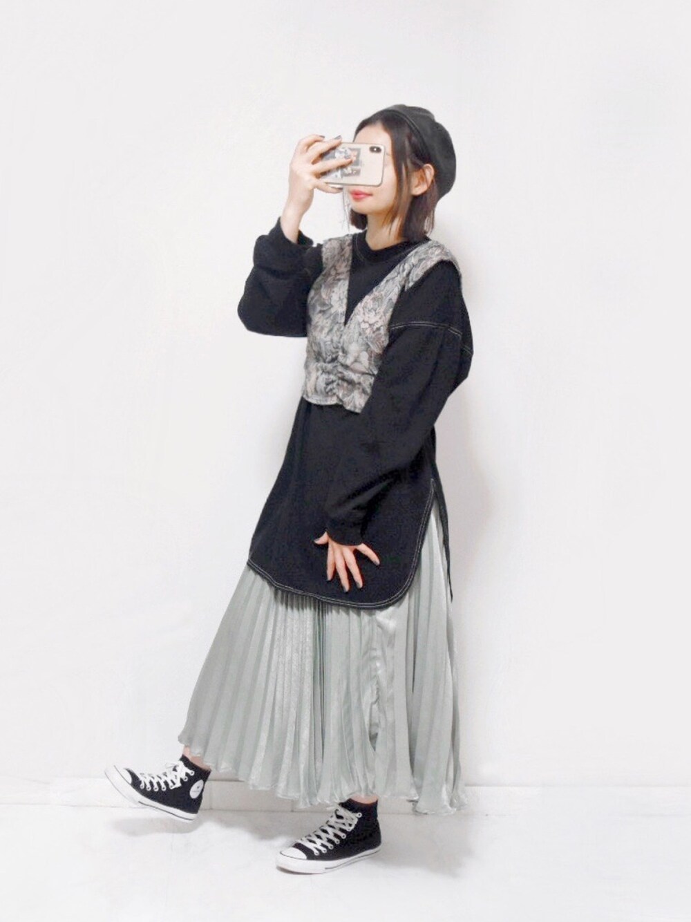 🌷🌷🌷 black × green くすみカラーなら秋も全然いけるね!! ベレー帽やロンTを使って秋感を出す!笑 ビスチェも夏限定アイテムにならんでよかった♡! プリーツのスカートは着回しコーデが 前々回の投稿にあるから見てみてね! converse👣 右25.3 左25.0 → 25.0 🌷Instagram🌷 director▶︎ piacere_ponner official▶︎ official_piacere