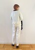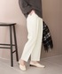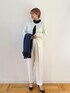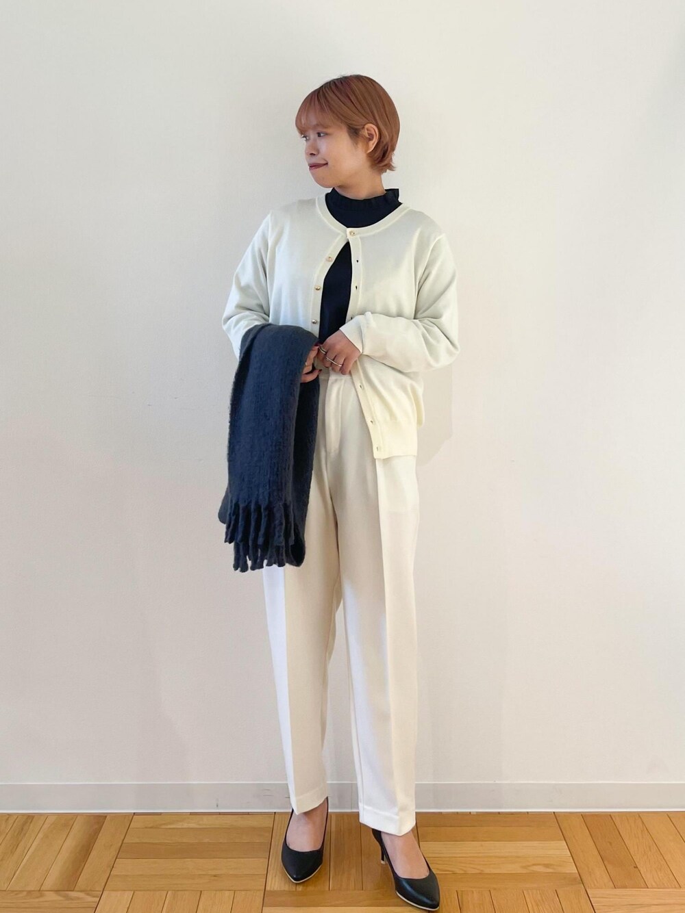 今回は仕事でも使いやすいスタイリングにしました。 トップスは落ち着いた色味にして、ボトムや羽織で軽さをだすために白をもってきたことがポイントです。
