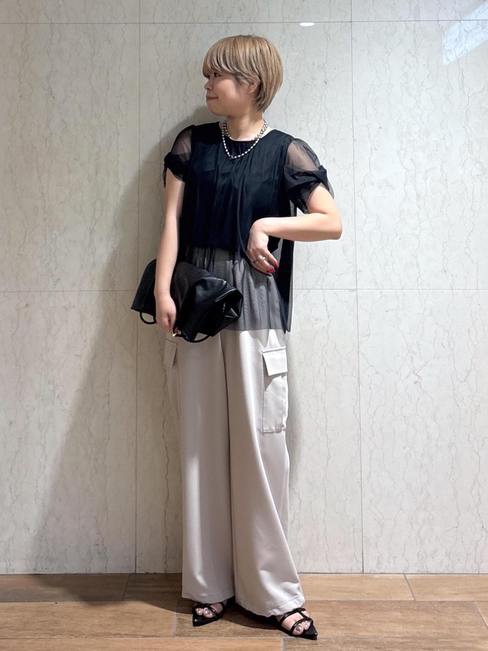 今回はキレイめな雰囲気のチュールトップスを主役にコーディネートを組みました。 キレイめすぎるよりは、カジュアル感をプラスしたスタイリングが好みなので、あえてパンツにカジュアルなカーゴパンツを合わせたことがポイントです。