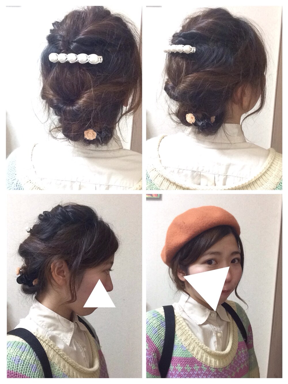 上から くるりんぱ くるりんぱ くるりんぱ 三つ編み丸めて クリップで留めただけ(^^) ピン要らずの簡単ヘアアレンジ。