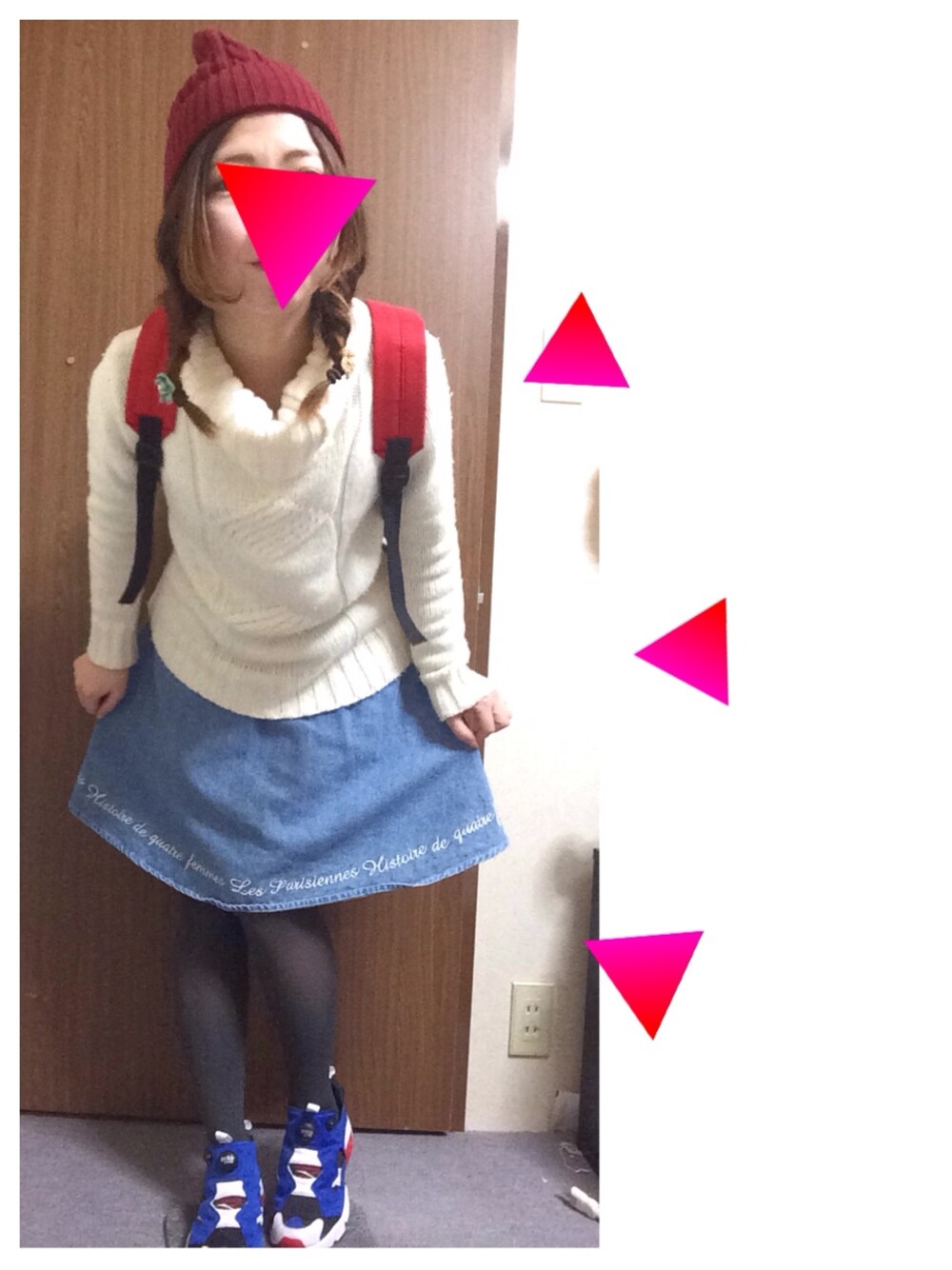 赤、白、青 自分の好きなコーディネート(^_^) このニットばっかり着ている。。 足が細く撮れた笑