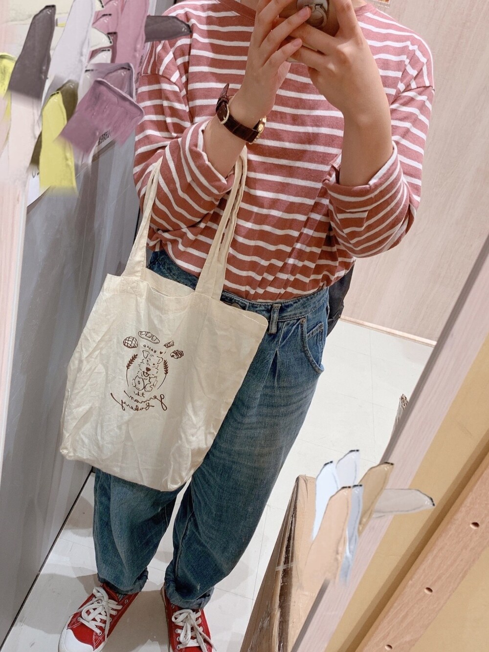 レッド系のスニーカーを着用したレディースの秋コーディネートの1枚目の写真