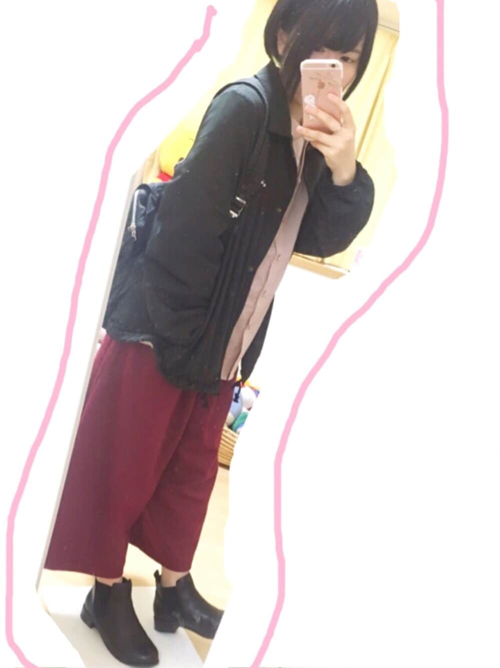 グラデーションコーデです❣️ トップスにくすみピンク、ボトムスにボルドーのグラデーションです😚❗️ 色の引き締めと可愛くなりすぎないようにブラックでスパイスを😎✨ 足首はあえてみせるようにして抜け感意識❗️ コーチジャケットとシルバーリングの相性が個人的にすき☺️💓