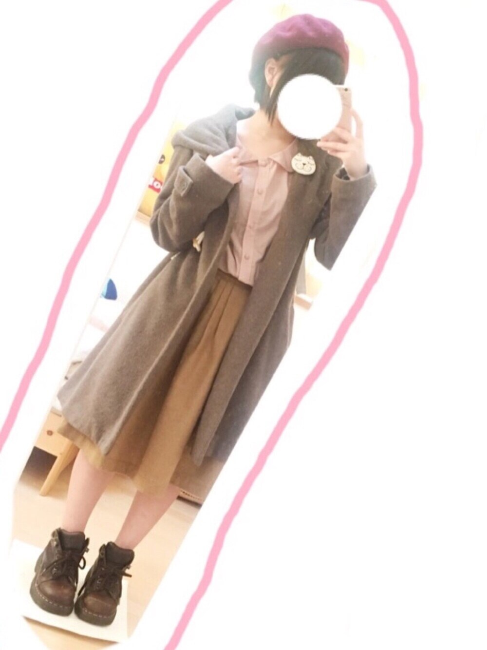 グラデーションコーデ🐻💖 赤とブラウンのグラデーションが気に入っています😋✨ 今日のコーデの1番のポイントはブローチです! ダッフルコートの襟元につけて、視線をあげることによって低身長をカバーしています🌟 チェスターコートにネクタイピンを付けているコーデをたまに見かけるので、そこからヒントを得ました😌💭✨ 最近は低身長さんからのフォローも多いので、少しでもお役に立てたら嬉しいです٩(๑❛ᴗ❛๑)۶💖