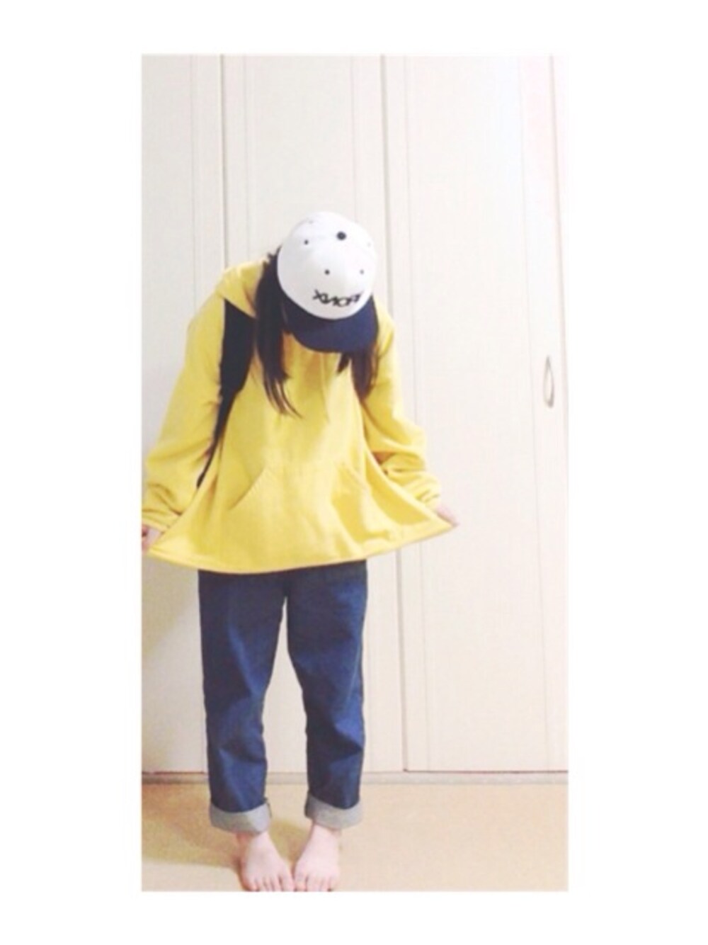 古着の黄色のパーカを デニムと合わせて みました。 が、 自分的にイマイチです(笑)