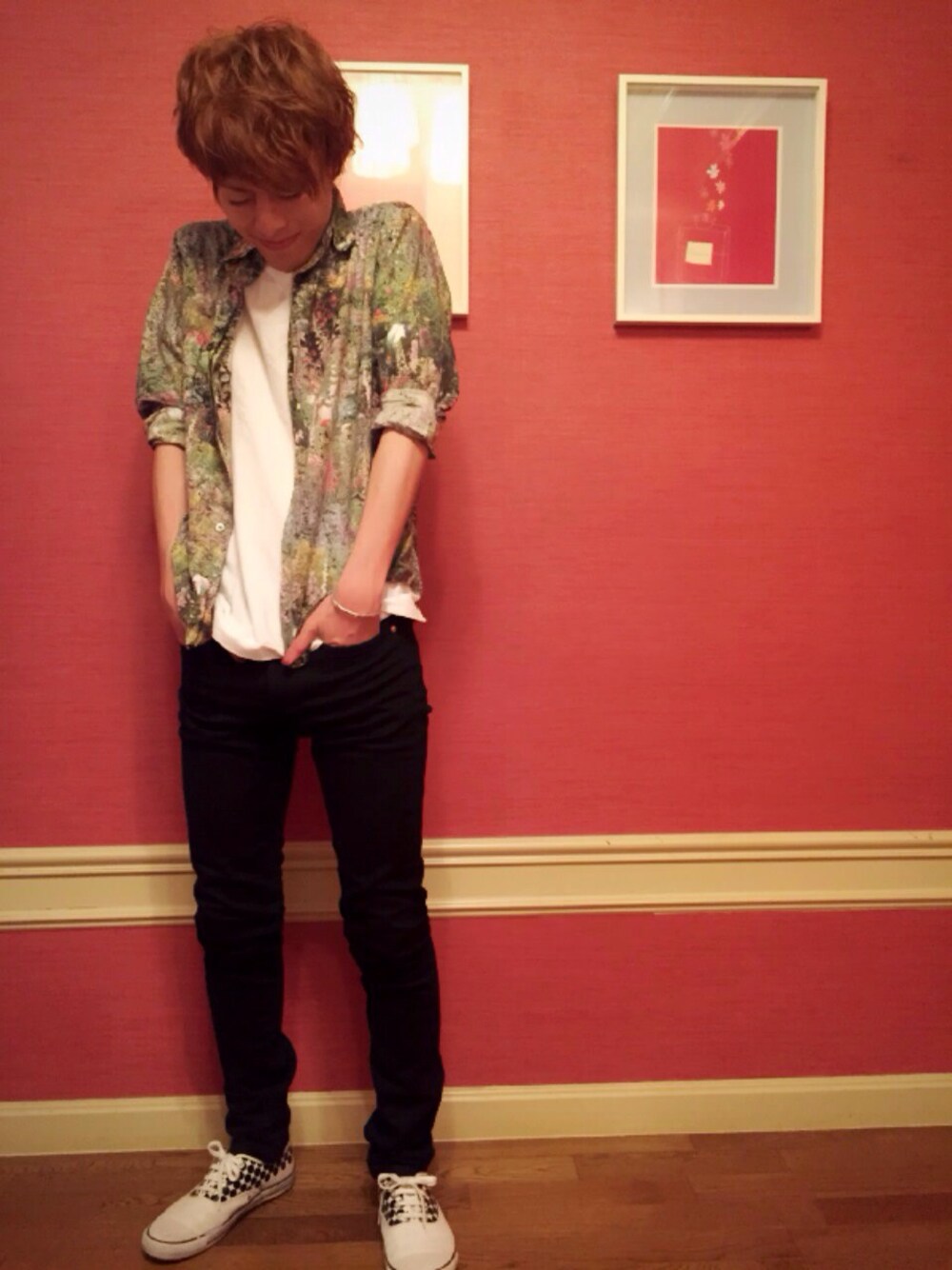 肩にめちゃ力入ってますね、、、。 撮られなれてないです。。。汗 このシャツを活かすために あえてシャツやパンツはシンプルです!はいっ!笑