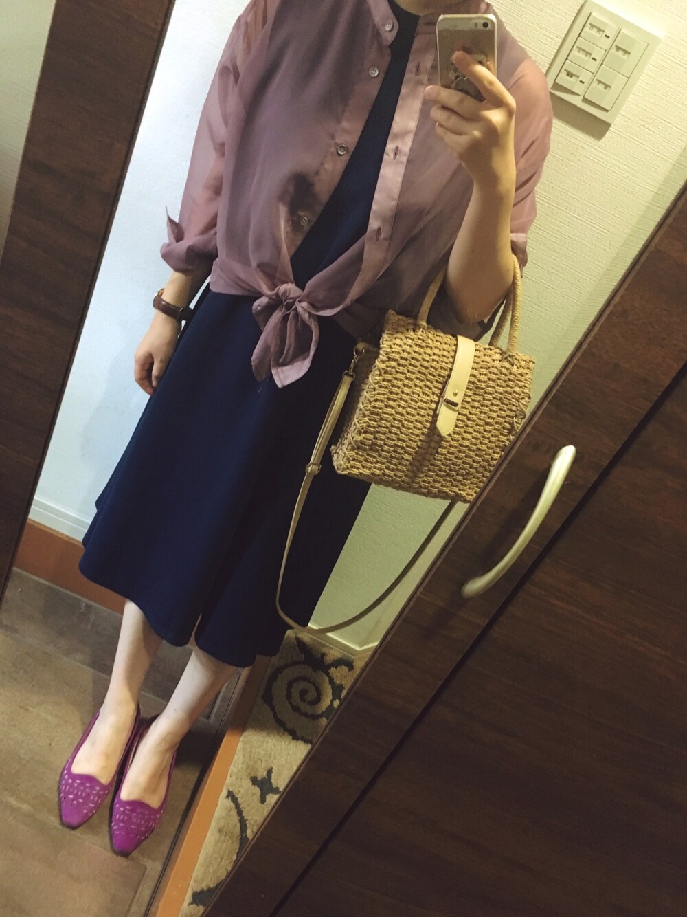 シアーシャツを羽織りに☺︎ パープルコーデ。 でも暑かった… そして、結局台風の影響で電車に乗れず出勤できずに帰ってきました…