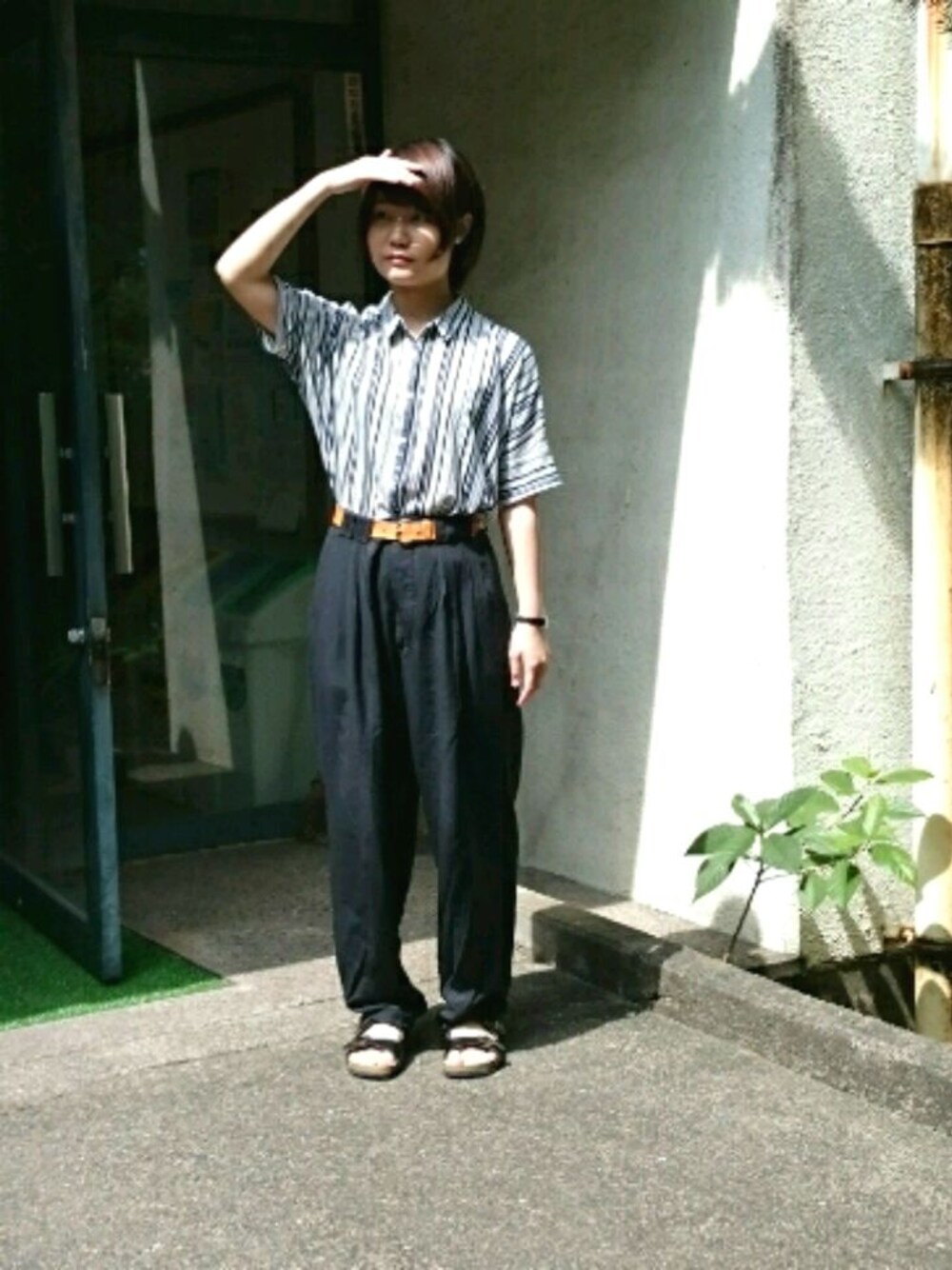 ブラック系のスラックスを着用したレディースの夏コーディネートの1枚目の写真