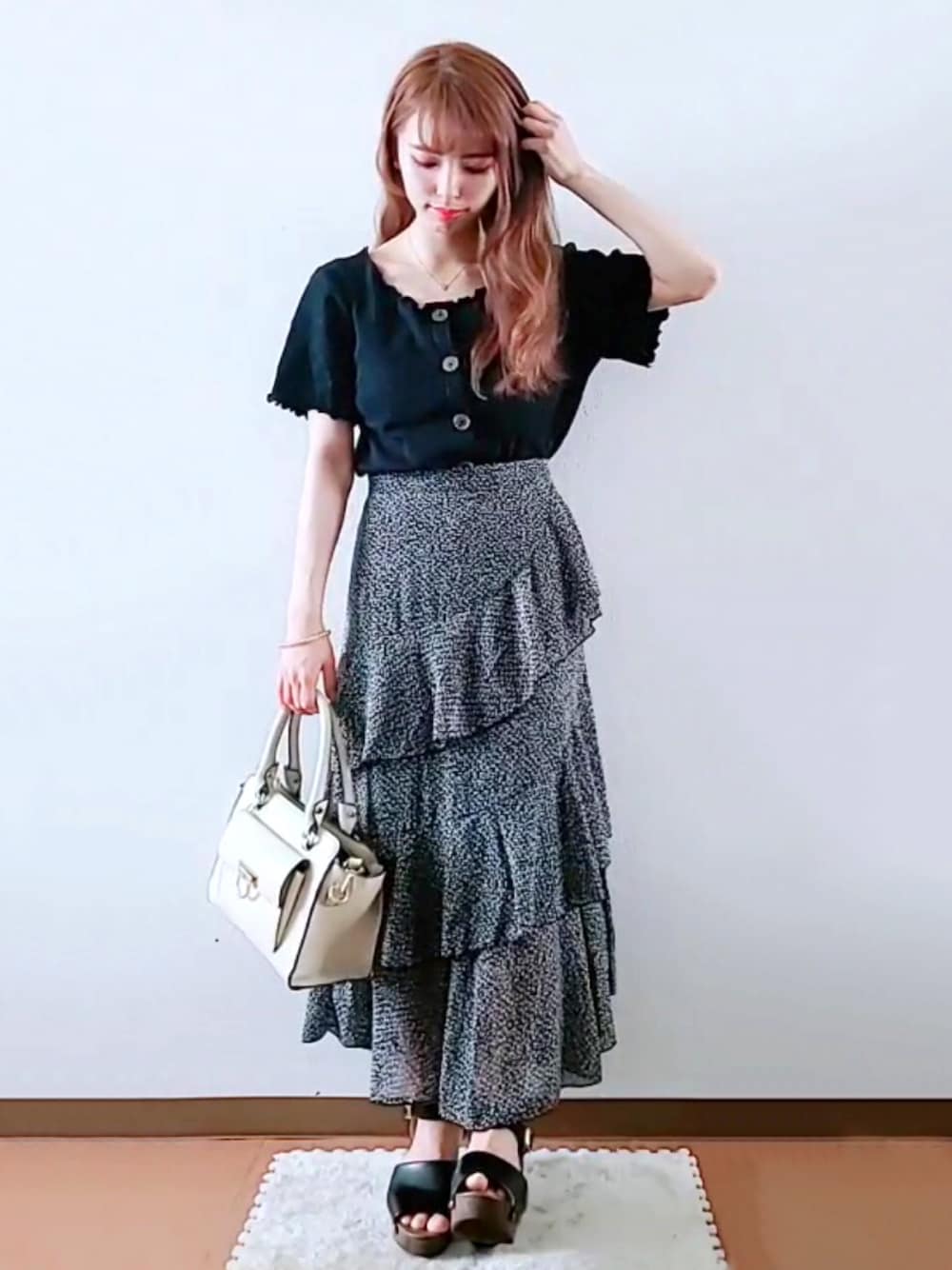 ぽーのスカート「フラワーティアードフレアスカート」を使ったコーディネート