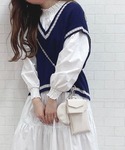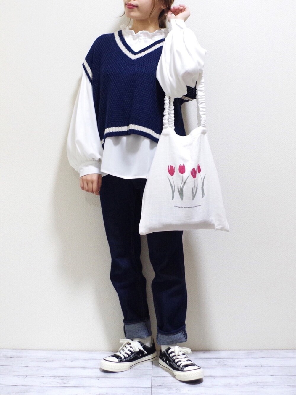 ニットベストコーデ୨୧*.゚ 短めの丈のベストでレイヤードにすると 視線が上に行くから脚長に見えてよき👌 全体的に ネイビー × ホワイト で まとめたシンプルなコーデ ◡̎✧ この前お迎えしたチューリップのトートバック 差し色赤と持ち手クシュクシュがかわいい〜🌷 ▽着回しコーデと別ショット Instagram / pooo___24 オススメコスメの紹介もしています✨ いいね、お気に入り、フォルダイン、 フォローもありがとうございます ◡̎✧